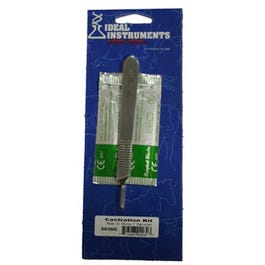 Castration kit, includes 1 scalpel with handle, 3 #10 surgical blades curved & 3 #12 surgical blades hooked.