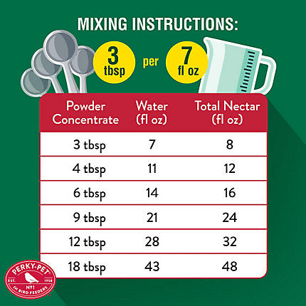 Perky-Pet® Instant Nectar 5.3 oz Packet makes 32 oz of nectar when mixed with water. Nectar mix contains natural sweeteners that do not require boiling.